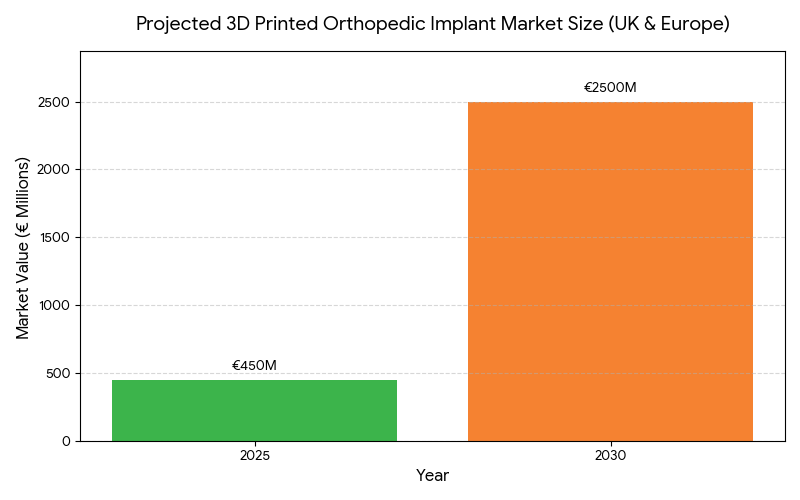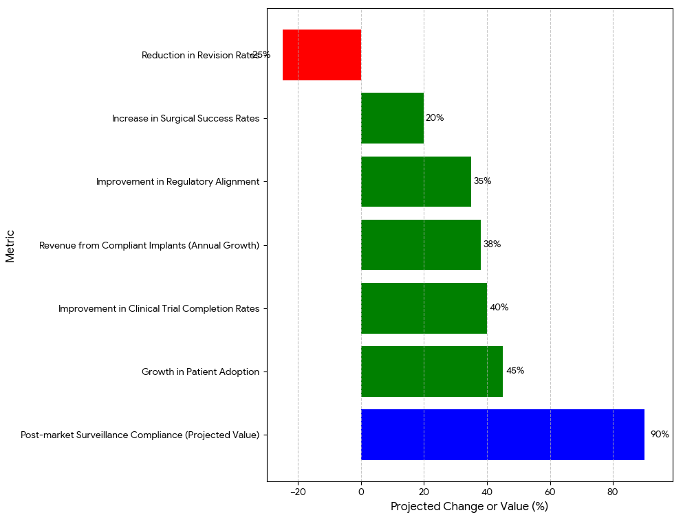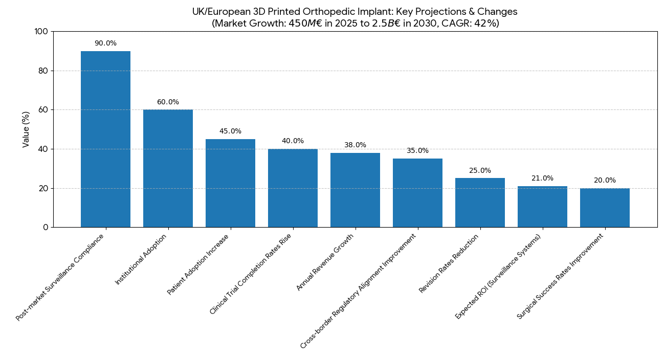 The 3D printed orthopedic implant market in UK and Europe is projected to grow from €450 million in 2025 to €2.5 billion by 2030, CAGR 42%, driven by technological innovation and regulatory advancements. Key trends include the widespread adoption of post-market surveillance frameworks, which are projected to achieve 90% compliance by 2030. Revision rates for 3D printed implants are expected to decrease 25%, enhancing patient outcomes and reducing healthcare costs. Surgical success rates are projected to increase 20%, facilitated by standardized monitoring of implant performance and feedback-driven improvements. Cross-border regulatory alignment is projected to improve 35%, enabling smoother commercialization across EU member states. Patient adoption will grow 45% as confidence in implant safety rises. Clinical trial completion rates will improve 40%, accelerating approvals for innovative 3D printed devices. Revenue from compliant implants is expected to grow 38% annually, supported by higher adoption and improved safety metrics. ROI is projected at 18–24%, driven by reduced revision surgeries, cost savings, and faster product commercialization. These trends indicate that regulatory harmonization and effective post-market monitoring are key drivers of growth, safety, and profitability for 3D printed orthopedic implants in the European market.