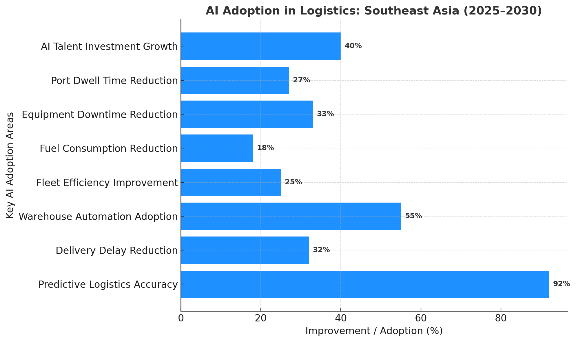 Several trends define the next wave of AI adoption in logistics across Southeast Asia. (1) Predictive Logistics: AI algorithms enable demand forecasting with 92% accuracy, reducing delivery delays by 32%. (2) Autonomous Warehouses: By 2030, over 55% of warehouses in Thailand will operate partially automated, using AI-driven robotics for inventory management. (3) Smart Fleet Management: Machine learning route optimization increases fleet efficiency by 25% and reduces fuel consumption by 18%, cutting logistics emissions by 20%. (4) Predictive Maintenance: AI-based maintenance systems lower equipment downtime by 33%, improving asset utilization. (5) AI in Port Logistics: Thailand’s Laem Chabang Port adopts AI container scheduling systems, reducing average dwell time by 27%. (6) Data Integration Platforms: Cross-border logistics platforms powered by AI allow real-time visibility across ASEAN supply chains. (7) Sustainability: AI supports carbon footprint tracking, aligning with Thailand’s Net Zero 2050 roadmap. (8) Public-Private Partnerships: Government-backed initiatives like the AI Logistics Sandbox (Bangkok) are fostering pilot programs for autonomous trucks and digital twins. (9) AI Talent Development: Investments in logistics AI training grow +40%, led by ASEAN universities. Collectively, these trends transform Southeast Asia into an AI logistics innovation hub, optimizing every aspect of trade and transportation.