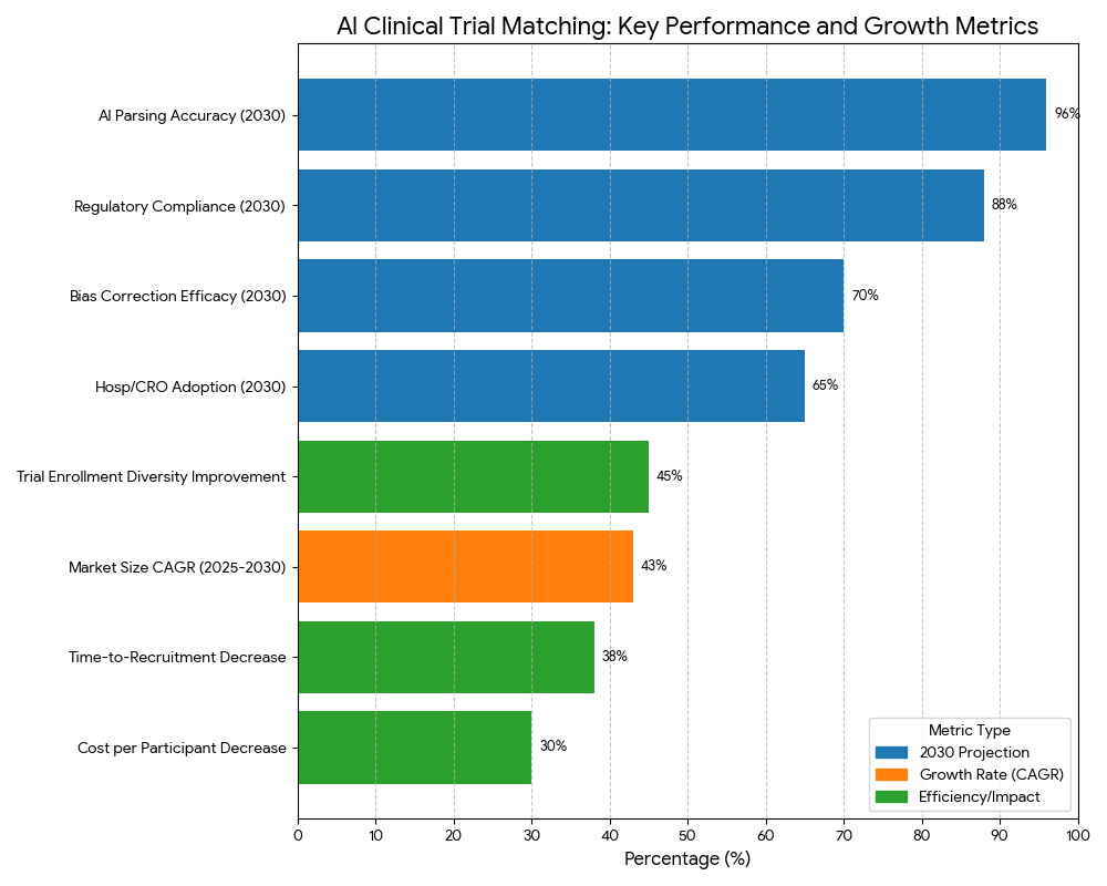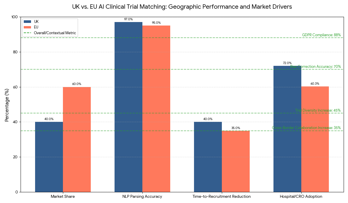 In UK and Europe, AI-driven clinical trial matching is expanding rapidly, reaching €1.9 billion by 2030, with the UK holding 40% share and the EU 60%. The UK’s NHS data infrastructure and regulatory sandboxes accelerate adoption, pushing NLP parsing accuracy to 97%, compared to 95% EU average. Time-to-recruitment reduction reaches 40% in the UK and 35% across EU nations, driven by improved EHR interoperability. GDPR compliance under AI-driven models is estimated at 88%, with ongoing initiatives to align AI Act regulations for medical research. Trial diversity will increase 45%, supported by inclusive datasets and targeted digital outreach. Hospital and CRO adoption is expected at 65% overall, but higher (72%) in UK health systems due to centralized data-sharing frameworks. Cost per participant will decline 30%, with ROI between 20–28%. Cross-border collaboration in AI matching projects is expected to grow 35%, especially through EU’s Horizon Europe program. Bias correction models will reach 70% accuracy, ensuring equitable trial representation. Collectively, the UK and Europe will establish the benchmark for AI-augmented trial recruitment, combining technological efficiency with ethical governance, redefining the speed and inclusivity of clinical research.