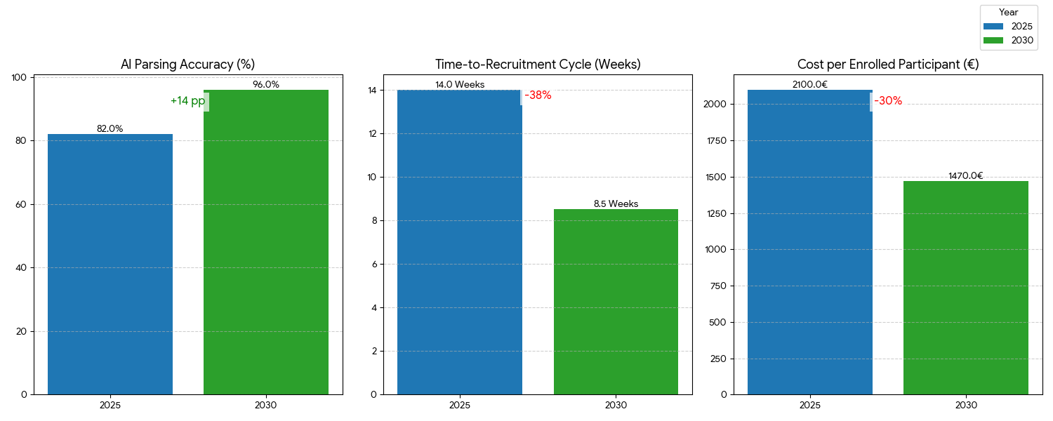 Between 2025 and 2030, AI-driven clinical trial recruitment platforms are set to transform patient matching workflows across Europe, growing at a CAGR of 43%. The integration of NLP and ML algorithms improves eligibility text parsing accuracy from 82% to 96%, minimizing manual screening labor. Diversity representation within trials will rise 45%, supported by automated bias detection models that monitor demographic imbalance in real time. The cost per enrolled patient will decline 30%, while time-to-recruitment will shorten by 38%. By 2030, 65% of hospitals and CROs will have implemented AI-driven matching solutions, supported by regulatory frameworks achieving 88% compliance with GDPR and MHRA guidelines. The ROI for adopters is projected at 20–28%, stemming from reduced administrative burden, improved recruitment precision, and faster trial activation. Operational metrics show that data processing latency will drop 60%, and eligibility misclassification rates will fall from 14% to 5%. The AI parsing ecosystem—including EHR connectivity, clinical coding ontologies, and consent analytics—enables seamless matching between patients and trial protocols. As healthcare institutions expand data-sharing partnerships, cross-border collaboration between UK and EU trial networks will rise 35%, further expanding recruitment pools. By 2030, the use of AI-based enrollment will be central to achieving faster, fairer, and more successful clinical trials across Europe.