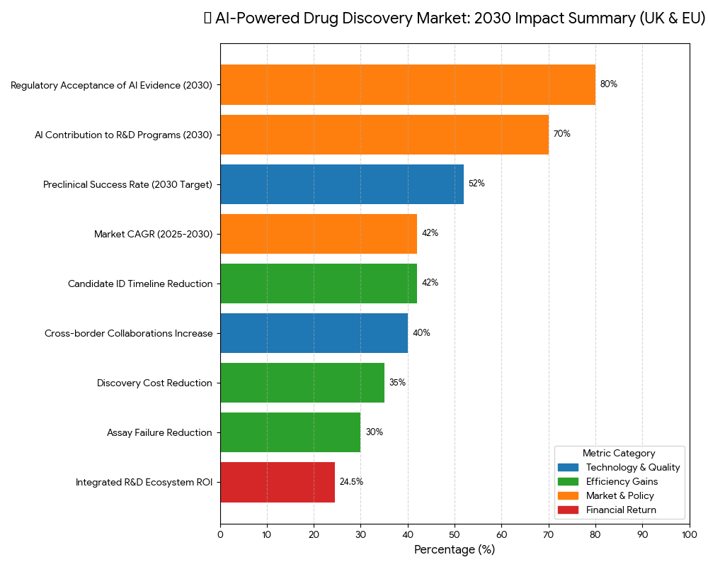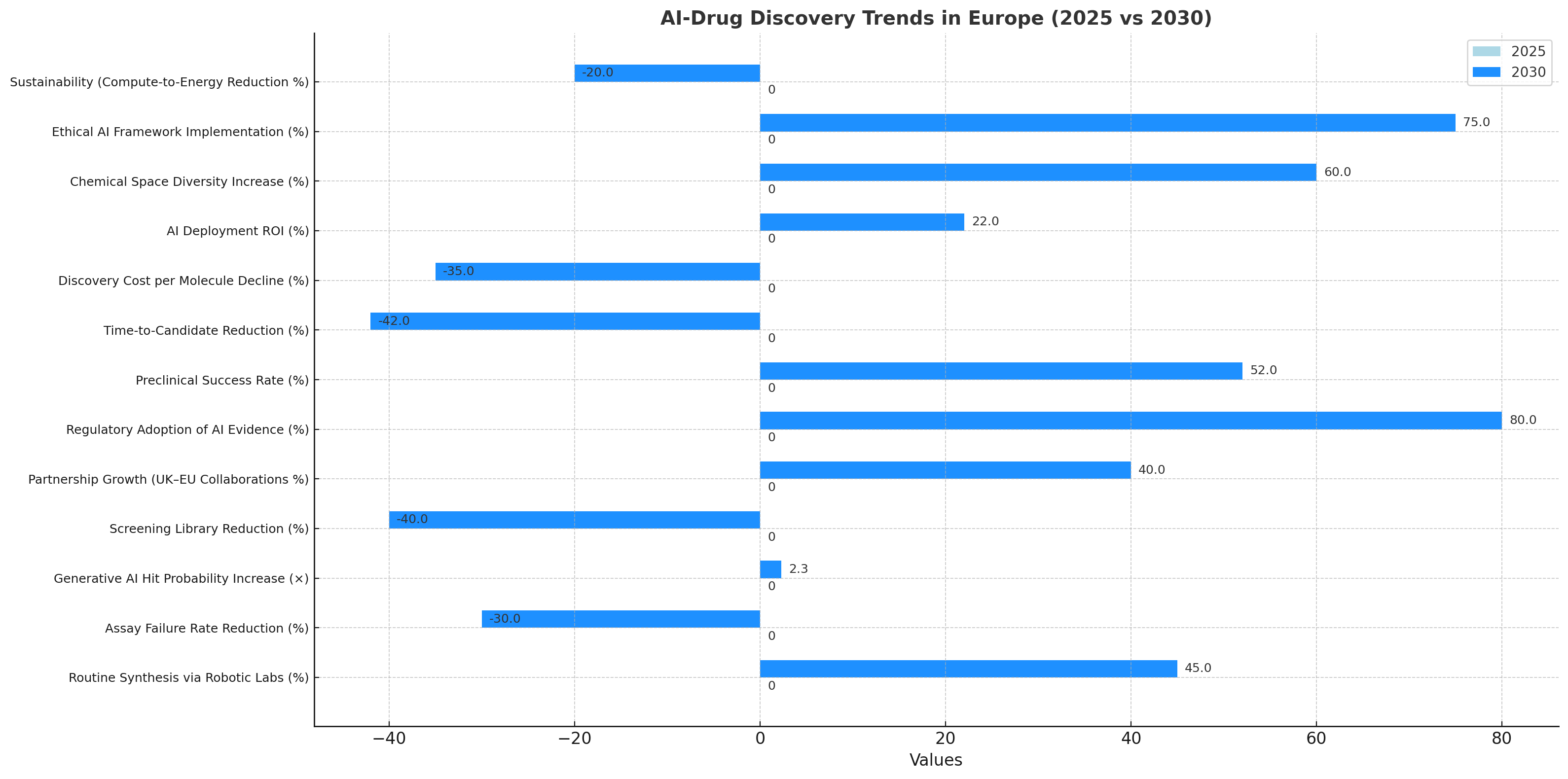 Between 2025–2030, AI integration across UK/EU drug discovery will redefine R&D economics. The market’s €8.7 billion value by 2030 reflects consolidation of AI vendors, CROs, and pharma alliances. Core efficiency drivers include multi-omics-integrated modeling, which elevates hit identification accuracy +45%, and active learning algorithms that cut data-curation time –50%. Average discovery cost per molecule decreases 35% to €117 M, while candidate development cycles compress by 1.7 years. Preclinical success rate improves from 32 → 52%, driven by early toxicity forecasting and de-risked lead optimization. Generative AI tools create 2.3× more viable candidates per computational run, improving pipeline throughput. Cross-border partnerships between UK biotechs and continental CDMOs increase 40%, aided by shared regulatory sandboxes under EMA Innovation Task Force frameworks. Regulatory recognition of AI outputs—projected at 80% acceptance—reduces IND review lag by 25%. Assay failure rates decline 30%, while wet-lab automation raises reproducibility 15 points. Financially, ROI 22–27% stems from lower CapEx, shorter R&D lead times, and fewer terminated trials. The emerging model blends computational generation, robotic validation, and cloud-native collaboration, positioning the UK and EU as first movers in data-driven pharmaceutical R&D.