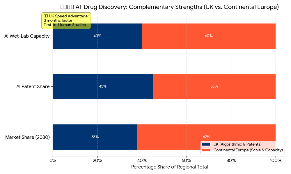 The UK (38%) and continental Europe (62%) jointly drive AI-drug discovery. The UK leads in algorithmic development and access to NHS Genomics data, supporting >45% of regional AI patents. EU hubs—Germany, France, Switzerland, Netherlands—anchor large-scale wet-lab automation. Market size expands to €8.7 billion by 2030, with CAGR 42%. Candidate identification shortens 4.1 → 2.4 years, and cost per molecule drops 35%. Regulatory acceptance under EMA and MHRA harmonization hits 80%, reducing submission lag 25%. Cross-border AI partnerships rise 40%, supported by Horizon Europe and AI Act alignment. Preclinical success increases to 52%, and ROI 22–27% reflects efficient multi-jurisdictional R&D. UK’s agile approval processes speed first-in-human studies 3 months faster than EU average. Continental centers excel in scalability, with Germany and France housing 60% of AI wet-lab capacity. Combined, these geographies form a complementary innovation corridor—the UK providing algorithmic excellence, Europe ensuring industrial scale—collectively redefining global pharmaceutical competitiveness.