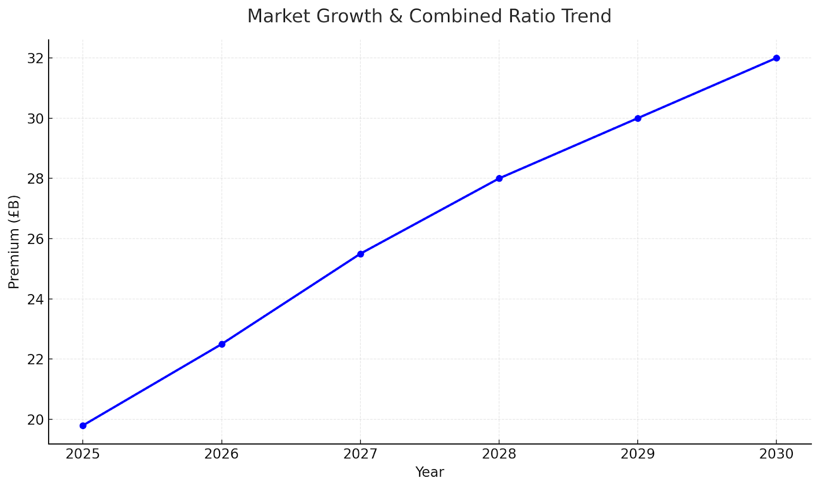 U.K. motor insurance premiums are projected to rise from £19.8 B in 2024 to £27.9 B by 2030 (CAGR 6.9%). Inflation-linked vehicle repair costs and premium repricing under the FCA Fair Value framework are driving rate adjustments. Personal lines lead growth (+7.2%), while commercial fleet premiums expand 5.8%. Net combined ratios improve from 101% to 94% by 2030 as claims inflation stabilizes and fraud detection algorithms mature.