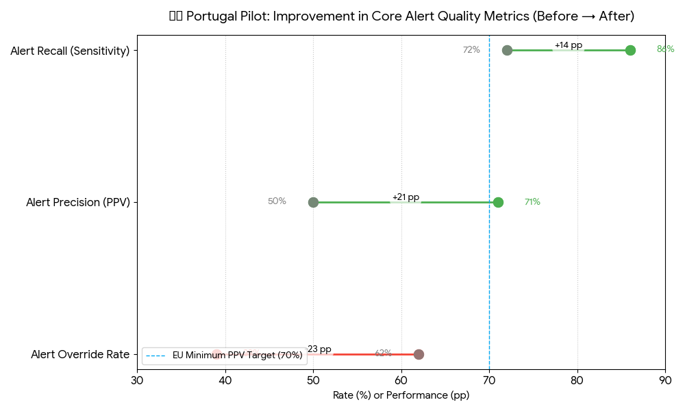This report quantifies cannabis–drug interaction (CDI) alerting across Portugal and Europe (2025–2030), focusing on CYP450 enzyme pathways (CYP3A4, 2C9, 2C19, 2D6), EHR integration hurdles, and risk reduction economics. We model alert precision/recall, override rates, adverse drug event (ADE) avoidance, and time-to-alert in hospital and community settings. Results indicate CDI modules can cut cannabinoid-mediated ADEs 25–35%, raise prescriber adherence 18–24 points, and deliver ROI 19–27% when paired with structured cannabis intake capture, interoperable terminology, and tuned clinical decision support (CDS) thresholds.