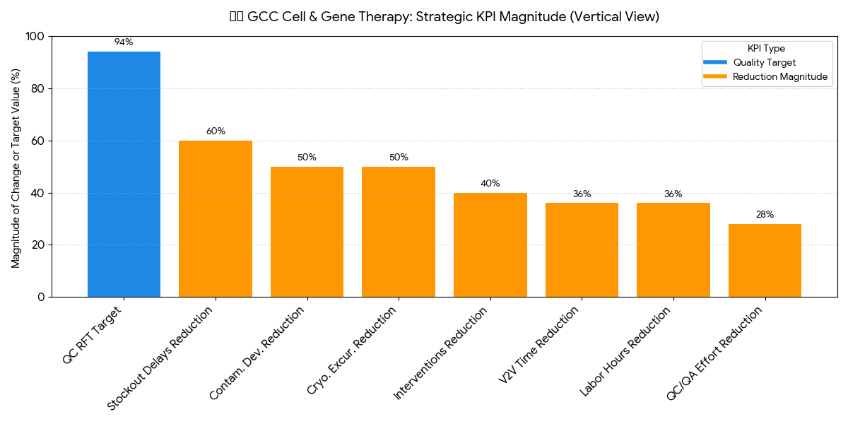 Three trends define 2025–2030. (A) Modular multi-product suites: skid-based, closed systems dominate, enabling <8-hour changeovers and CapEx −24% per 100-patient capacity. This lets providers tune capacity to demand waves without overbuilding cleanrooms. (B) Digital QA and rapid micro: routine adoption of rapid sterility (≤7 days), ddPCR titer checks, and eBR review bots compresses release 21 → 12 days while holding quality—false-failures −25–30%. (C) Lane standardization: GCC-wide lane qualifications (airport-centric in Jeddah, Riyadh, Dubai) with unified SOPs drive excursions −50% and on-time-delivery 92% → 97%. Additional insights: workforce cross-training lifts flex staffing +45%, cutting overtime and backfill; energy & sustainability gains appear as right-sized HVAC and less rework reduce energy intensity −10–12% per run. CDMO consolidation continues as platforms integrate vector, cell, and fill-finish, offering single-contract accountability. Risk posture shifts from asepsis to supply continuity (bags, filters, resins); dual-sourcing to ≥80% of SKUs reduces stock-out days from ~7 → ~3/quarter. For payers, V2V 14 days becomes the benchmark tied to reimbursement timeliness. Finally, data transparency (live dashboards, genealogy, and chain-of-identity proofs) moves from “nice-to-have” to tender-scored capability, rewarding sites that can verify custody from apheresis through infusion.
