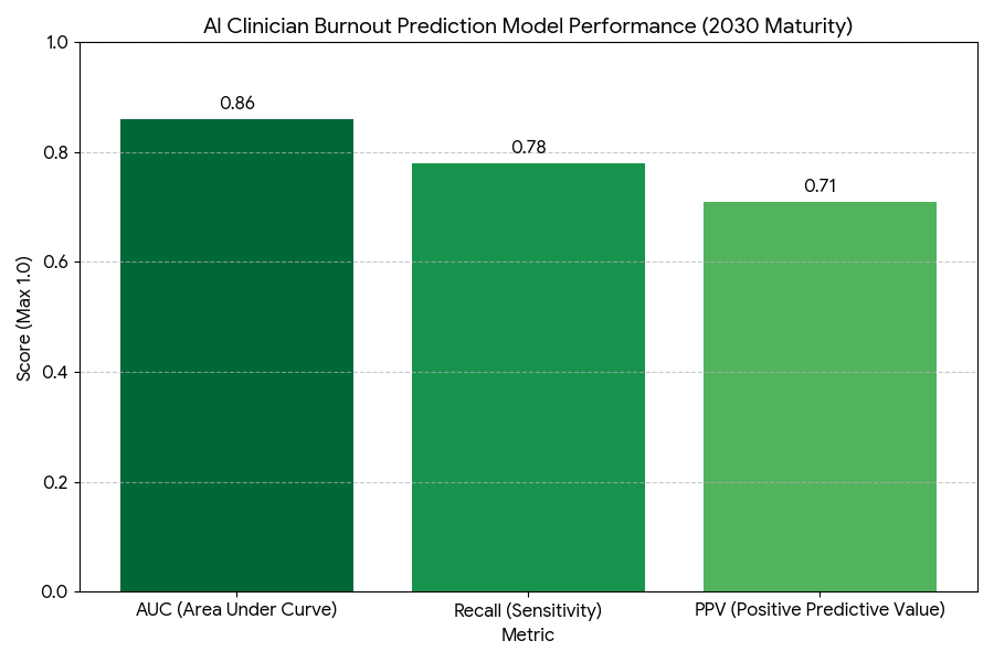 The AI-enabled clinician burnout prediction market in the US and EU expands from $0.75 billion (2025) to $2.9 billion (2030) at a ~31% CAGR, as staffing shortages, rising administrative load, and value-based payment pressures push systems to adopt proactive risk analytics. Spend concentrates in integrated delivery networks, academic medical centers, and large ambulatory groups, with the US comprising ~68% of 2030 outlays and the EU ~32%. Revenue splits into platform subscriptions (46%), implementation & change management (29%), data/privacy compliance services (15%), and analytics add-ons (10%). By 2030, typical production deployments analyze EHR clickstreams, message volumes, inbox backlog velocity, note sentiment/affect, after-hours usage, schedule density, and time-in-room telemetry. Average model performance matures to AUC 0.86 / PPV 0.71 / recall 0.78, supported by hierarchical time-series and foundation-model NLP fine-tuned on clinical corpora. Health systems report time-to-intervention falling from ~18 days to ~6.5 days, with targeted interventions (scribe pooling, schedule smoothing, inbox load-balancing, mental health access) reducing turnover 12–18% and after-hours EHR time 20–28%. The top 10 vendors control ~67% of spend by 2030, but regional SI partners remain critical to localization and governance. Procurement increasingly requires privacy-by-design attestations, bias and drift reports, and explainability artifacts for clinician trust, institutional review, and labor bodies.
