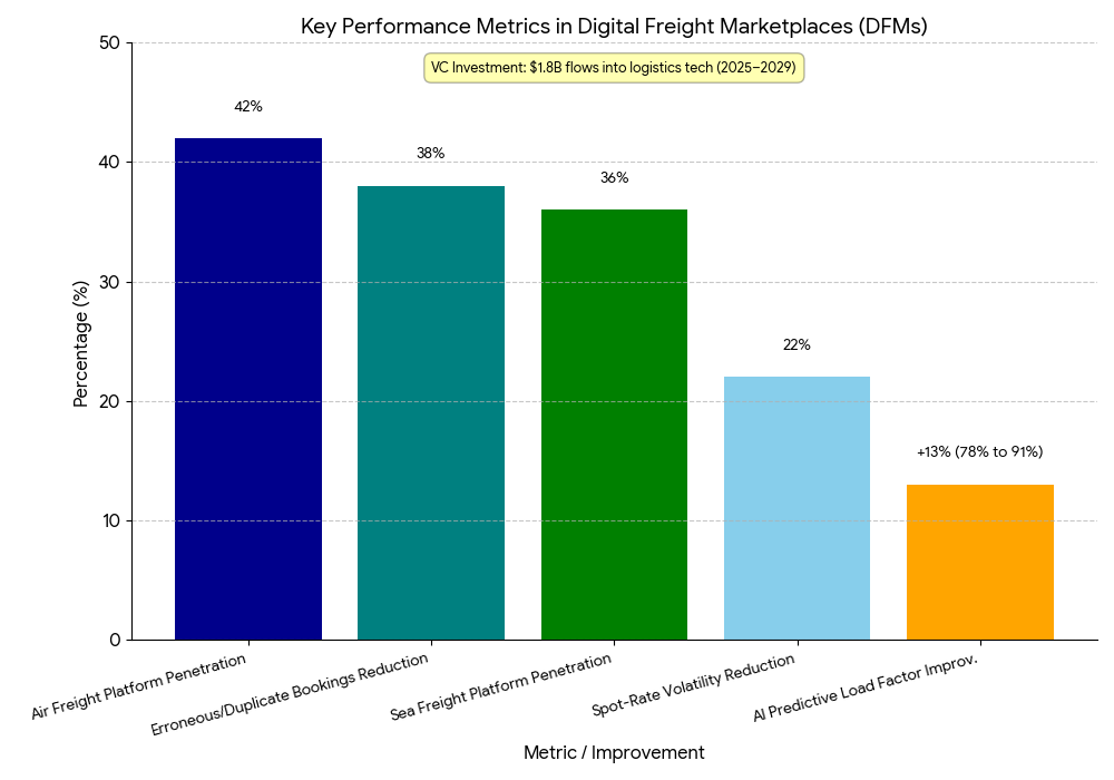 Between 2025 and 2030, digital freight marketplaces (DFMs) in Southeast Asia are projected to grow from $3.8B to $14.5B (CAGR 30.8%), as logistics providers digitize procurement and real-time booking processes for air and sea freight. Singapore, anchoring 39% of regional trade volume, leads adoption through its NextGen Logistics Program and Smart Port 2030 initiative. DFMs are improving booking transparency (+46%), cost efficiency (−22%), and route predictability (+33%). By 2030, over 70% of regional freight forwarding transactions will be managed via platform-based marketplaces.