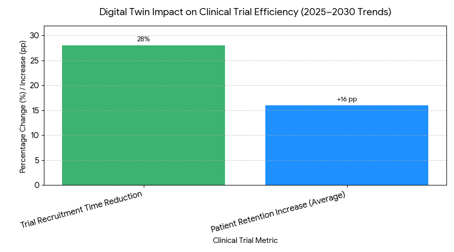 This report quantifies the impact of digital twin technology on clinical trial patient recruitment and retention strategies in North America (2025–2030). Focusing on the adoption of virtual patient models and predictive analytics, we explore how digital twin simulations optimize recruitment, minimize dropout rates, and improve data quality across Phase I-III clinical trials. By 2030, the market grows from $2.4B to $7.9B (CAGR 27%), as sponsors and CROs incorporate AI-driven twins to boost patient engagement, reduce time-to-enroll, and enhance protocol adherence. ROI for sponsors ranges from 18–26% via reduced recruitment timelines and improved protocol compliance, ultimately lowering trial costs.