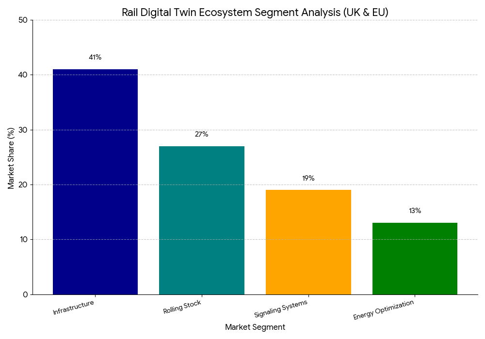 The rail digital twin ecosystem segments into infrastructure (41%), rolling stock (27%), signaling systems (19%), and energy optimization (13%). Infrastructure twins dominate, supporting predictive maintenance of tracks and bridges across 12,000+ km of UK and EU high-speed corridors. Rolling stock twins enable remote diagnostics for 25,000 trains, reducing mechanical downtime by 40%. Signaling system twins—integrated under the European Train Control System (ETCS)—facilitate virtual validation of signal logic, reducing test time by 35%. Energy optimization modules, powered by real-time telemetry, lower energy consumption by 22% through smart traction algorithms. UK firms, including Network Rail Digital Services, HS2 Ltd., and AtkinsRéalis, are leading R&D pilots with global tech partners like Siemens Mobility and Bentley Systems. By 2030, integrated twins will orchestrate end-to-end network simulation, unifying engineering, energy, and operations data under one predictive digital ecosystem.