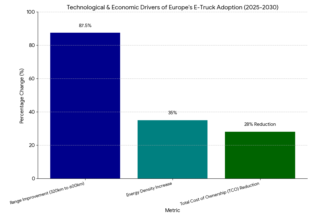 Europe’s E-truck ecosystem is accelerating due to technological readiness, favorable policy, and cost reduction. The average energy density of truck batteries rose 35% between 2025 and 2030, improving range from 320 km to 600 km. Germany’s Federal Ministry for Digital and Transport (BMDV) allocated €1.2B in fleet electrification incentives under its Kraftverkehr program. Logistics giants like DHL, DB Schenker, and Dachser are electrifying regional fleets to meet corporate net-zero goals. The European Investment Bank (EIB) provided $2.3B in infrastructure loans for megawatt charging hubs across Germany, France, and the Netherlands. TCO analysis shows operating cost declines of 28%, primarily from fuel and maintenance savings. Battery recycling capacity, led by Northvolt and Umicore, strengthens sustainability across the supply chain. By 2030, E-trucks will represent 18% of Europe’s new heavy vehicle sales, signaling mass adoption across the continent’s logistics sector.