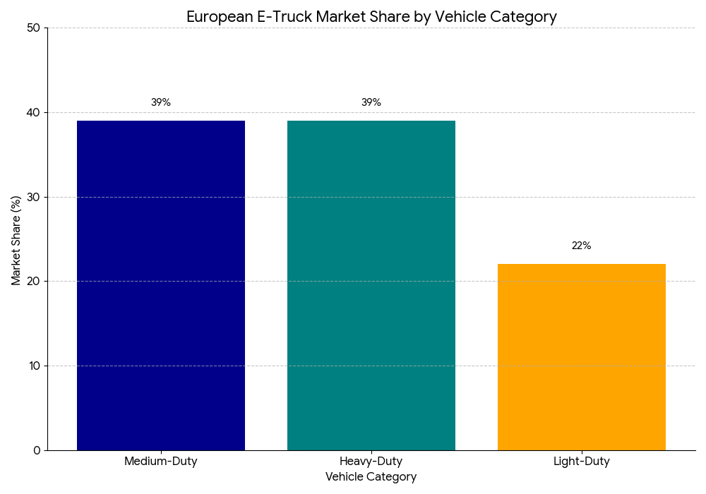 The market divides into light-duty (22%), medium-duty (39%), and heavy-duty (39%) E-truck categories. Medium-duty trucks dominate regional logistics fleets, especially in urban and intercity delivery routes. Heavy-duty long-haul E-trucks, achieving range improvements up to 650 km, are forecasted to grow 6.4× by 2030. Light-duty trucks, targeting city logistics, benefit from short-range cost efficiency, with average ownership cost reductions of 31%. Germany’s MAN eTruck and Mercedes eActros 600, alongside Volvo FH Electric, lead sales across Europe. Charging infrastructure segmentation shows fast-charging hubs (54%), depot-based charging (33%), and on-route megawatt systems (13%). Market fragmentation is declining as OEMs partner with utilities like E.ON and EnBW for grid-ready logistics hubs. By 2030, E-trucks are expected to capture 27% of total European road freight value, reshaping operational economics across distribution chains.