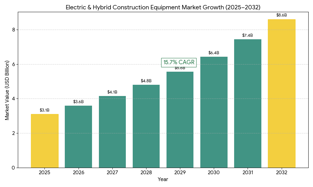 The market will grow from USD 3.1 billion in 2025 to USD 8.6 billion by 2032, driven by a 15.7% CAGR. Electric excavators lead with 30% share, followed by hybrid loaders and dozers (28%). The demand for electric compact equipment is surging as cities enforce zero-emission construction zones. Public infrastructure projects including roads, bridges, and municipal redevelopment account for nearly 45% of equipment deployments. OEM alliances such as Volvo CE–Hitachi and Caterpillar–Cummins are investing in modular battery packs and hydrogen hybrid prototypes. With over €120 billion in EU Green Deal investments, the region’s construction electrification pace is outpacing North America, particularly in the Nordic and Benelux markets.