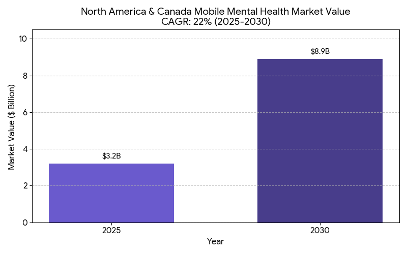 The mobile mental health market in North America and Canada is poised to grow from $3.2 billion in 2025 to $8.9 billion by 2030, representing a 22% CAGR. The primary drivers of growth include the increasing adoption of mobile therapy apps and teletherapy platforms, which make mental health care more accessible, particularly in underserved regions. Mobile therapy apps represent 40% of the market, driven by the rise in user-friendly digital tools for patients and mental health professionals. The expansion of AI-driven diagnostic tools and real-time data tracking is enhancing patient engagement, improving retention rates by +24% and overall clinical outcomes by +15%. By 2030, mobile platforms are projected to improve access to care by 30% in regions where mental health workforce shortages are most pronounced. Community-based models—in which mobile platforms are used to extend care into local communities—contribute to 23% cost reduction in rural areas by enabling at-home therapy and virtual consultations. The integration of AI algorithms for diagnosis and treatment will also contribute to more efficient care delivery, increasing the speed of diagnosis and reducing care delivery costs by 19%. By 2030, ROI from these digital mental health interventions is estimated at 17–25%, driven by increased patient retention and the ability to support more patients with fewer in-person visits.