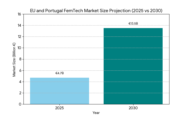 This report analyzes the FemTech market penetration across the EU and Portugal (2025–2030), focusing on cultural barriers, reimbursement challenges, and consumer adoption. The FemTech market, which includes digital health solutions for women’s health, is expected to grow from €4.7B to €13.5B (CAGR 23%) by 2030. Key drivers include overcoming cultural stigmas, expanding reimbursement coverage, and increasing awareness of FemTech solutions for fertility, menstruation, menopause, and mental health. By 2030, Portugal will capture ~5% of the EU FemTech market share, as both public and private insurance begin to reimburse for FemTech-related products, improving access to care for women’s health.