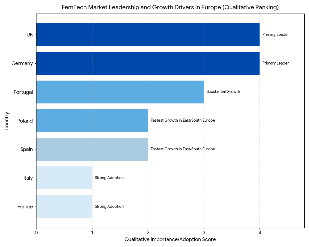 In Europe, the UK and Germany are expected to be the primary leaders in FemTech adoption, with Germany seeing the highest reimbursement rates and consumer adoption. Portugal will see substantial growth, reaching 5% of the EU FemTech market by 2030, due to newly adopted public and private insurance programs for reproductive health and mental health solutions. Other EU countries such as France and Italy will also show strong adoption, but cultural barriers may slow early-stage penetration compared to Northern Europe. As awareness campaigns and patient advocacy groups continue to grow, consumer adoption will increase by 30% by 2030, while cultural stigmas surrounding women’s health will begin to ease. East and Southern European countries will follow, with Spain and Poland experiencing the fastest growth in FemTech adoption. Regulatory frameworks, including the EU Health Digitalization Strategy, will provide the necessary backbone to ensure cross-border interoperability and data privacy standards across countries, which will drive overall FemTech market expansion in Europe.