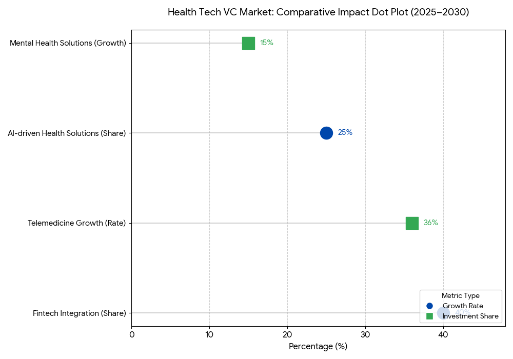 Key trends that will shape the health tech venture capital market from 2025–2030 include the integration of AI in healthcare, the growth of telemedicine, mental health solutions, and fintech in health tech. AI technologies will drive the largest share of VC investments, expected to account for 36% of the total market. These innovations will play a key role in transforming patient care through AI-powered diagnostics, predictive models, and automated medical solutions. Telemedicine will continue to grow rapidly, as virtual care platforms become more common, particularly with the rise in demand for at-home healthcare services. The mental health sector will see increasing investment as mental health issues become more prevalent, driving +40% growth in VC funding by 2030. Additionally, fintech integration into health tech solutions will capture 15% of the market, especially for payment solutions and billing systems for healthcare providers. Regulatory compliance will also become a major driver for health tech investments, with investors focusing on companies that are capable of meeting stringent healthcare regulations like HIPAA and GDPR. These trends highlight the shift towards digital transformation in the healthcare industry, with a strong focus on AI, telemedicine, and patient-centered solutions.