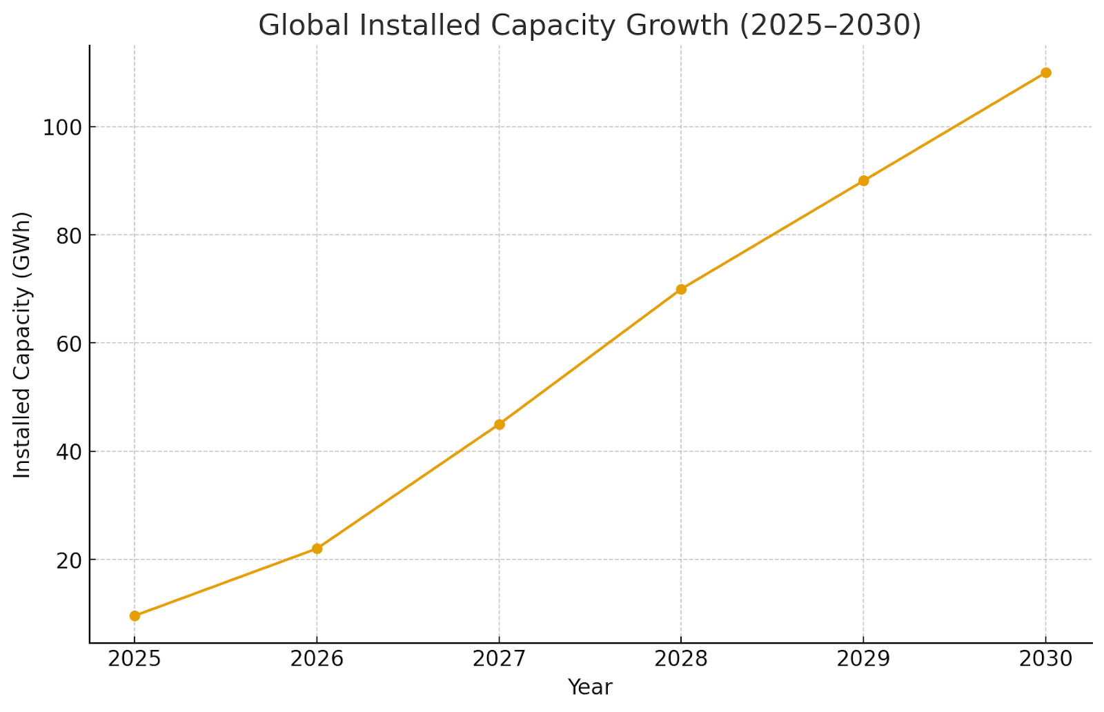 Sodium-ion batteries are projected to scale from <10 GWh in 2025 to ~110 GWh by 2030, with China accounting for 70% of this capacity. Initial adoption is led by grid-scale and two-wheeler applications. Rapid pilot-to-commercial transitions in 2026–27 are expected as BYD and HiNa Battery deploy large-scale facilities in Jiangsu and Gujarat. Global market penetration reaches ~12–15% by 2030, reflecting sodium’s cost and availability advantages over lithium.