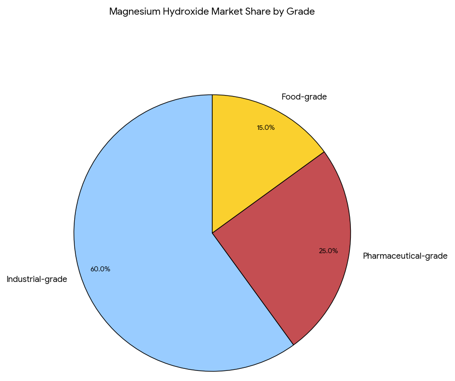 The market is segmented by grade: industrial-grade (60%), pharmaceutical-grade (25%), and food-grade (15%). The industrial-grade segment dominates due to the use of magnesium hydroxide in water treatment, flame retardants, and environmentally safe materials. Pharmaceutical-grade magnesium hydroxide is seeing growth due to increasing demand for natural antacids and laxatives. The food-grade segment remains smaller but is growing steadily as organic food additives are increasingly used for food preservation and safe consumption. Sodium hydroxide-based alternatives will remain a competitor in the water treatment segment, but magnesium hydroxide’s performance benefits are increasingly preferred.