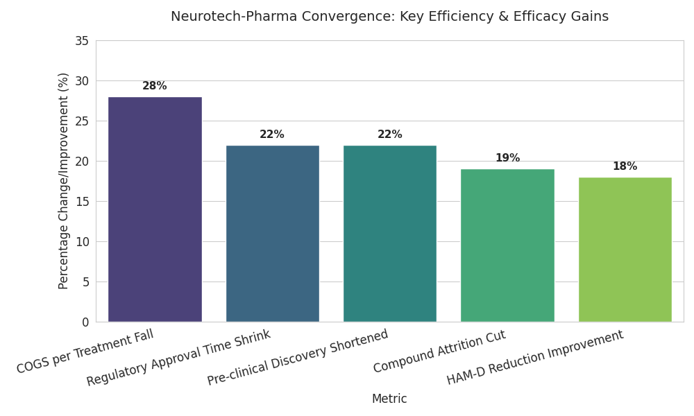 Five drivers shape this convergence. (1) Pipeline acceleration: AI-assisted lead discovery compresses design–synthesis cycles from 12 to 7 months, raising success rates 19%. (2) Clinical integration: adaptive-trial engines enable continuous dosing and neuromodulation adjustment, shortening time-to-approval 22%. (3) Cost structure: sensor miniaturization and modular manufacturing lower per-unit COGS €6,200 → €4,460, improving gross margins from 58% → 67%. (4) Capital inflow: funding scales from €0.9B (2025) to €4.7B (2030), 36% anchored in the UK; average Series B size triples to €62M. (5) Outcome-based reimbursement: 44 pilot contracts tie payment to ≥15-point HAM-D improvements. Barriers persist—ethics-board throughput (48 days median), interoperability gaps in data standards, and pricing uncertainty above €25k/course. Yet ROI models remain attractive: baseline payback ≤ 5 years at 70% utilization. Pharma entrants leverage digital twins for safety prediction, cutting SAE frequency 14%. Network share skews toward consortia integrating therapy, diagnostics, and cloud data; these outperform standalone firms on revenue CAGR (27% vs 15%). Market segmentation tightens: neurotech hardware 38% of value, companion drugs 34%, analytics 18%, clinical ops 10%. Hybrid IP models—device patents plus molecule exclusivity—extend monetization horizon to 2036. Consolidation rises: 2–3 cross-border M&As yearly as big pharma acquires signal-processing startups.