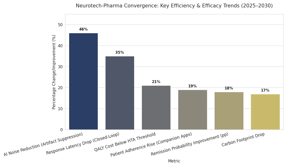 Three transformative trends define 2025–2030. 1. Closed-loop therapeutics: real-time EEG feedback adjusts drug dosing; response latency drops 35%, remission probability improves 18 points. 2. Digital biomarker validation: continuous mood and sleep data become regulatory endpoints; EMA accepts digital-biomarker evidence in 22 submissions by 2030. 3. Precision reimbursement: payers benchmark outcomes by QALY—hybrid treatments achieve €18,000–€24,000 per QALY, 21% below the HTA threshold. Technical progress includes high-density micro-electrode arrays with 64–256 channels and AI motion-artifact suppression reducing noise 46%. Patient adherence rises 19% as companion apps deliver behavior nudges. Cross-disciplinary ethics guidelines reduce trial deferrals 21%→9%, while cloud compliance platforms reach 97% audit readiness. Academic–industry collaborations triple publication output; translational grants €320M/year by 2030. Carbon footprint per therapy drops 17% via recyclable casings. Equity gaps close modestly: female enrollment 41%→48%. The trend toward “digital drug plus neurostim” ecosystems reshapes incentives—licensing fees linked to cumulative patient-outcome data. By decade’s end, regulators consider unified labeling for hybrid therapies. Quantitatively, efficiency gains yield €1.8B in system savings; 430,000 additional patients treated annually with enhanced remission outcomes.