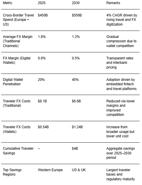 Several macro and technological trends drive this FX disruption. The convergence of fintech innovation and cross-border mobility has accelerated wallet adoption. Regulatory frameworks like PSD3 and Open Banking mandate transparency in fees, while the anticipated launch of the Digital Euro will further enhance consumer trust. Millennials and Gen Z travelers, prioritizing convenience and cost savings, are key demand catalysts. Meanwhile, the U.S. market lags due to fragmented regulatory oversight and entrenched credit card culture. However, U.S. fintech firms are aggressively partnering with global wallets, signaling upcoming acceleration. By 2030, the global FX revenue pool will rebalance toward digital-native players, with cross-border payment efficiency increasing by 35–40%. The structural outlook is clear: the wallet revolution is no longer a fintech sub-trend but a macroeconomic shift reshaping how money moves across borders.
