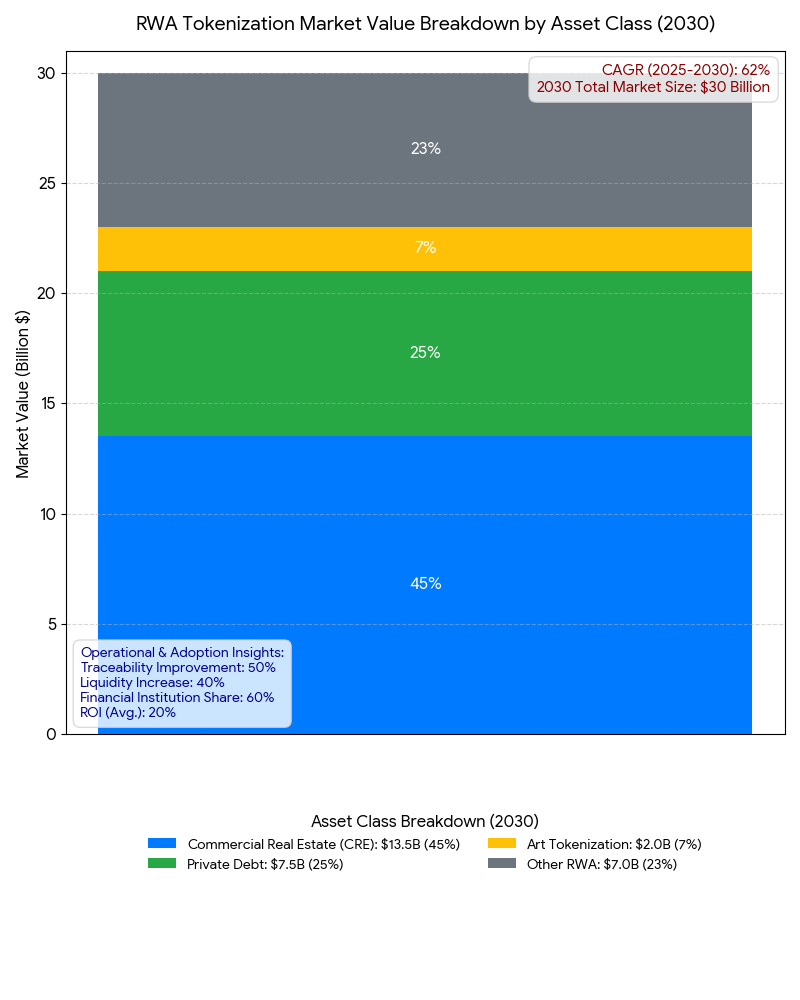 The tokenization of real-world assets market is expected to grow from $3 billion in 2025 to $30 billion by 2030, reflecting a CAGR of 62%. By 2030, the commercial real estate segment will account for 45% of the market, generating $13.5 billion in market value, driven by the demand for fractional ownership and increased asset liquidity. Private debt tokenization will represent 25% of the market, valued at $7.5 billion, as investors seek more accessible ways to invest in private equity and debt instruments. The art tokenization market is projected to grow to $2 billion by 2030, enabling fractional ownership and opening the art market to a broader pool of investors. The liquidity in tokenized assets is expected to increase by 40%, as blockchain solutions enable faster transactions, enhanced security, and more efficient ownership transfer. Institutional investors will account for 60% of market share by 2030, adopting tokenization platforms to enhance diversification, risk mitigation, and capital accessibility. Blockchain transparency will drive 50% improvement in asset traceability, reducing the risk of fraud and ensuring greater regulatory compliance. By 2030, the ROI from tokenization adoption is expected to be 18–22%, driven by cost savings, greater efficiency, and the ability to tap into new revenue streams.