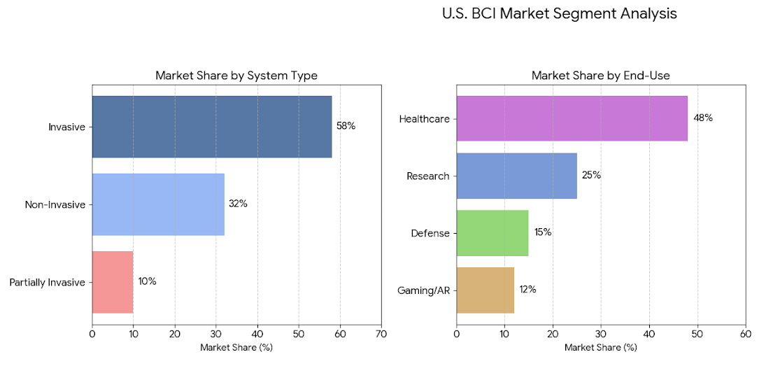 The U.S. BCI market divides into invasive, partially invasive, and non-invasive systems. Invasive BCIs (58%) dominate due to their superior signal quality and therapeutic relevance, particularly in motor rehabilitation and sensory restoration. Non-invasive BCIs (32%), mainly EEG and fNIRS-based, are expanding in consumer and research applications, while partially invasive systems (10%) serve clinical testing and hybrid interfaces. By end-use, healthcare (48%) leads, followed by research (25%), defense (15%), and gaming/AR (12%). AI-integrated BCIs, expected to represent 70% of devices by 2034, will blur the lines between neural decoding, cloud analytics, and behavioral prediction.