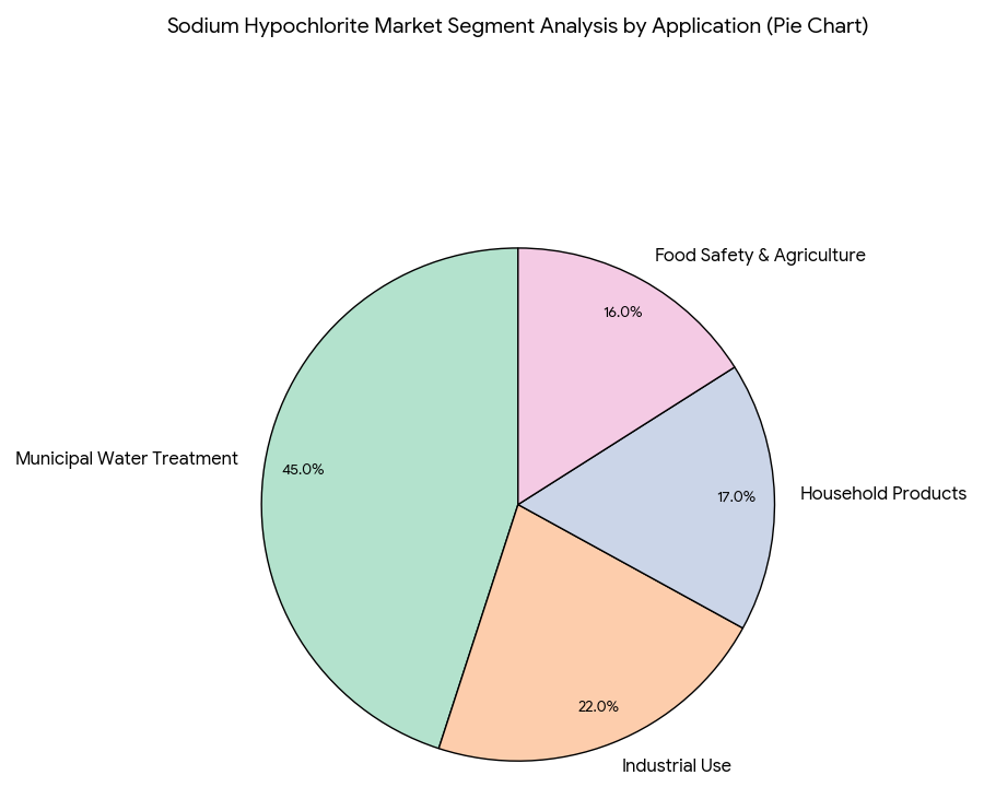 The market segments by application: municipal water treatment (45%), industrial use (22%), household products (17%), and food safety & agriculture (16%). The municipal sector leads due to growing water purification mandates, especially in rural and suburban areas. Industrial applications, including textile and paper bleaching, make up a significant portion of the demand. Food safety regulations, especially in meat processing and dairy, contribute to the growing need for sodium hypochlorite. Household products are poised to increase with the growing trend in health-conscious cleaning. The market is increasingly looking to integrate sustainable, low-VOC production methods to cater to regulatory pressures and the evolving consumer demand for safer cleaning products.